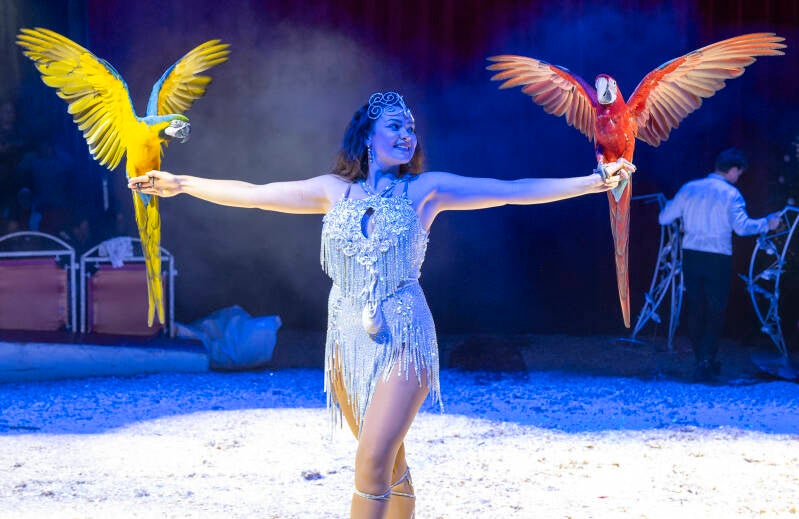 Kleurrijke ara’s vliegen vrij door de tent en tonen hoe speels en intelligent ze met hun trainer samenwerken.